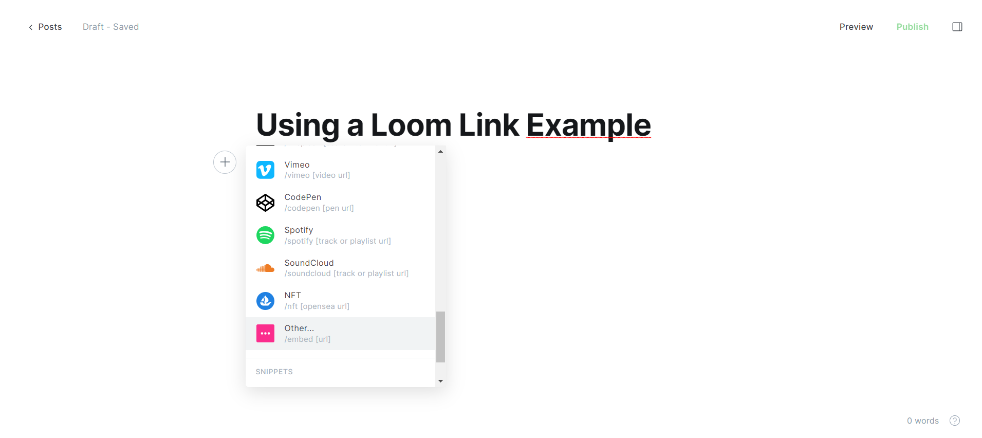 When you use the "Other... embed (url)" option in Ghost, you can paste the Loom-url that can be found in your Loom video-page. When you do this, it creates a huge amount of black area above and below the video when you post it. It is not always visible this will happen while you're creating the post, so it might happen afterwards. I definitly wouldn't choose this option. If you send out this Post as a newsletter option, it will however work without these black area in the email.